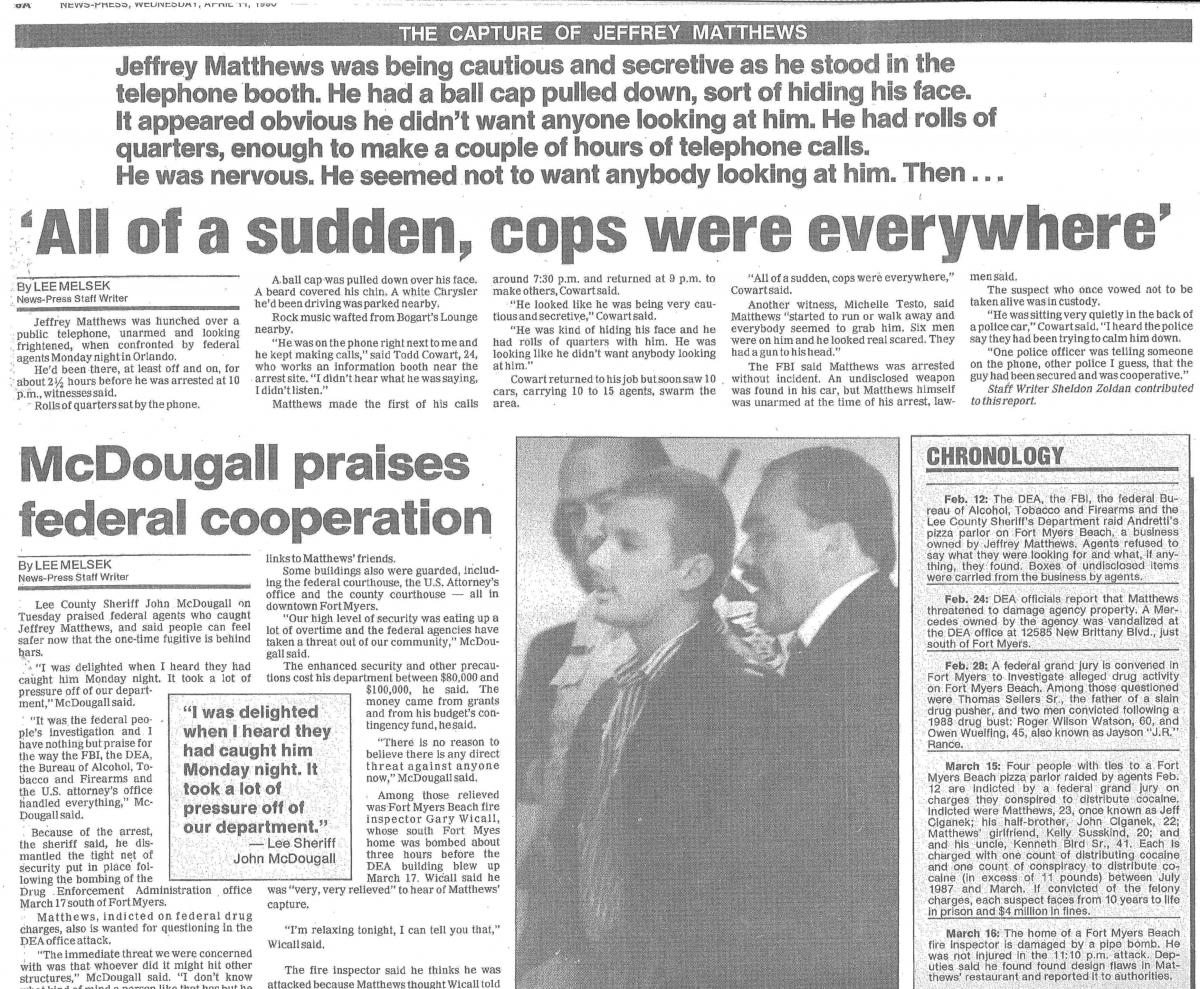 Matthews had been under investigation for several months, as the violence, murders, and shootings related to the drug trade made front page news. In February, the DEA and the Lee County Sherriff’s Department raided Andretti’s, removing boxes of evidence. Matthews made phone calls to the DEA, threatening to damage agency property. On March 15, 1990, Matthews was indicted, along with three other people, on charges of distributing cocaine, and a warrant was issued for his arrest.
